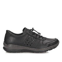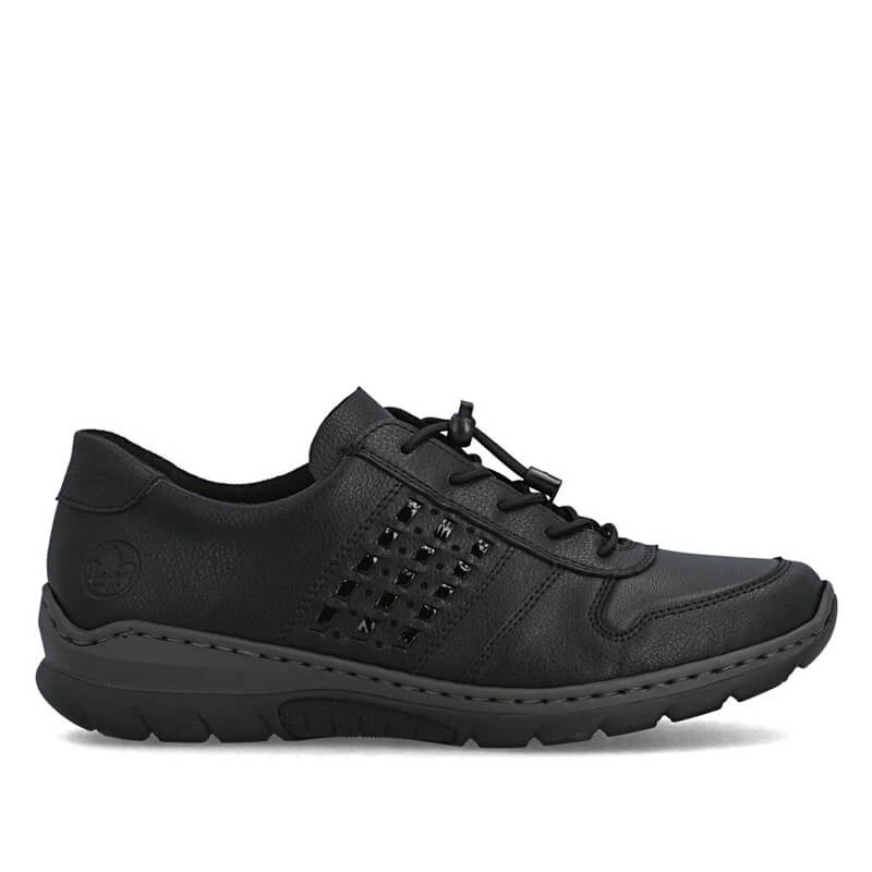 Wkładka z technologią Rieker Antistress tłumi wstrząsy i redukuje zmęczenie stóp przy długim chodzeniu; podszewka z materiału tekstylnego poprawia wentylację i zapobiega nadmiernemu poceniu. Idealne podczas całodziennej pracy stojącej, spacerów po mieście oraz podróży, gdzie komfort przez wiele godzin ma kluczowe znaczenie.