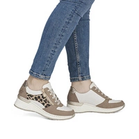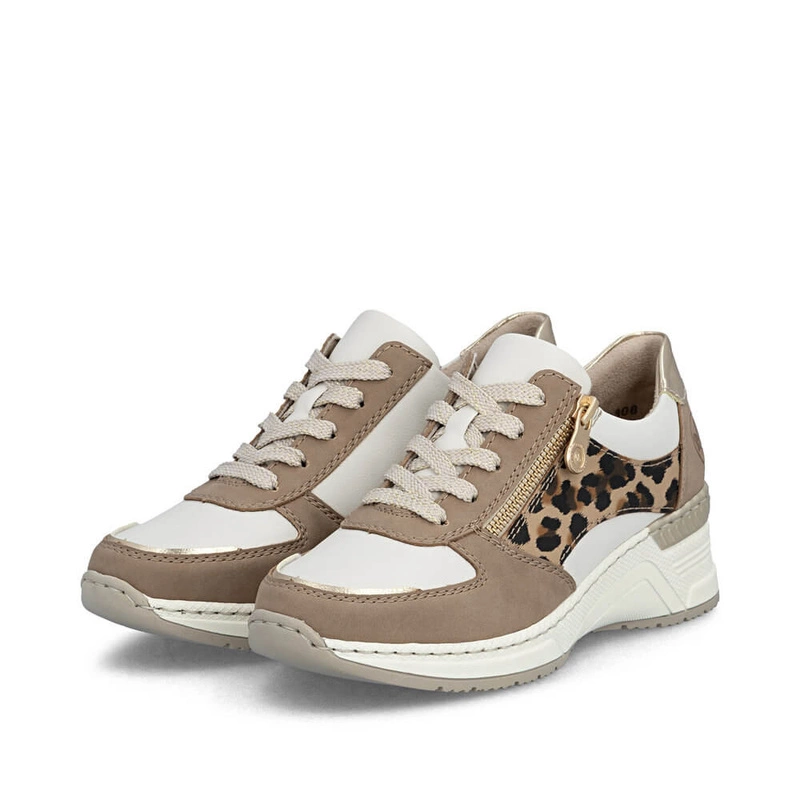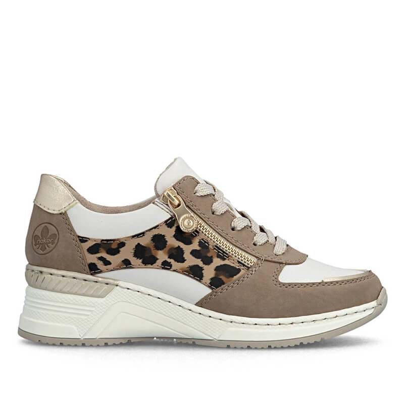 Buty marki Rieker łączą wyrazisty wzór inspirowany panterką z funkcjonalnymi rozwiązaniami projektowymi, oferując stylowy wygląd i codzienny komfort.