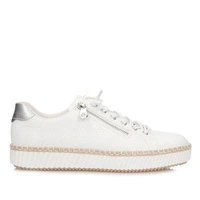Model M2940-80 marki Rieker łączy widoczną platformę z kontrastującymi akcentami kolorystycznymi; podeszwa na platformie daje subtelne podwyższenie przy jednoczesnym zachowaniu stabilności, a biało‑srebrna kolorystyka ułatwia dopasowanie do codziennych stylizacji. Sprawdzą się podczas spacerów po mieście i na zakupach, a także jako wygodny element casualowego outfitu do pracy z dłuższym staniem.
