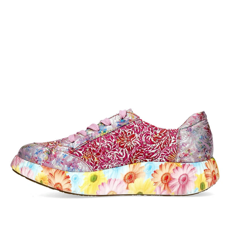 Kolorowa cholewka łączy intensywne odcienie (czerwony, różowy, fiolet oraz akcenty żółte), co nadaje butom charakteru i pozwala łatwo urozmaicić codzienne stylizacje; świetnie pasują do dżinsów, spódnicy midi lub sportowej sukienki, nadając każdemu outfitowi modny akcent. Podeszwa na platformie o wysokości 4 cm podnosi komfort oraz stabilność podczas dłuższych spacerów i miejskiego zwiedzania, jednocześnie dodając lekkiego efektu wysmuklenia — idealne na weekendowe wyjścia i spotkania z przyjaciółmi.