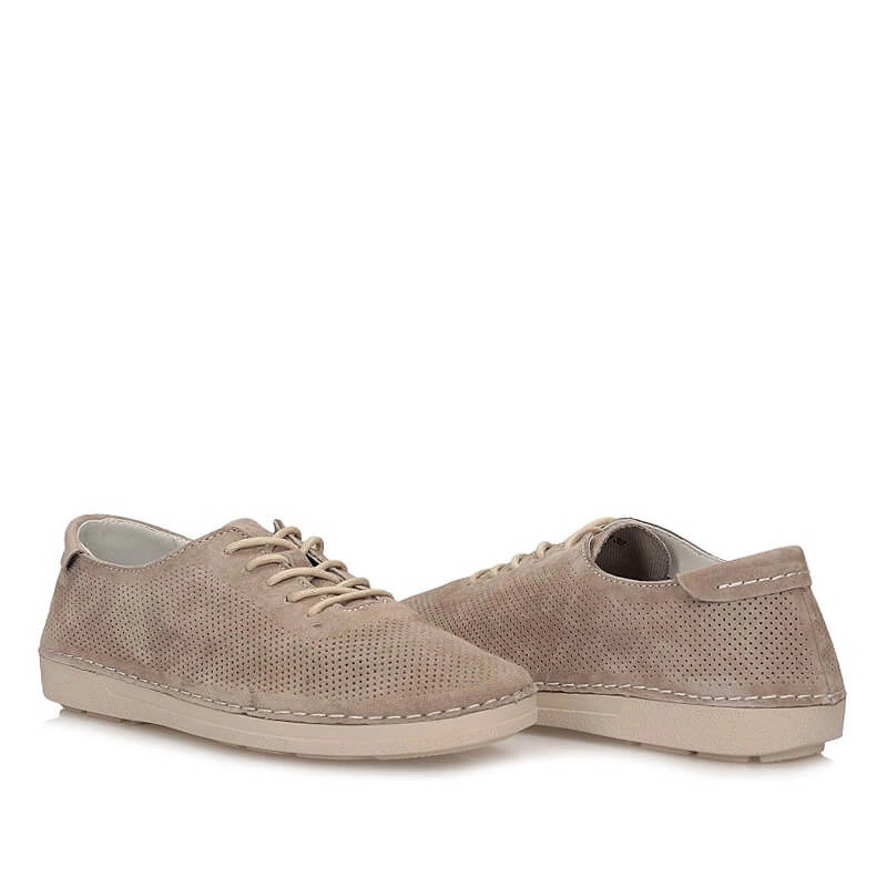 Półbuty damskie skórzane beżowe — przewiewna cholewka i zamszowa faktura
