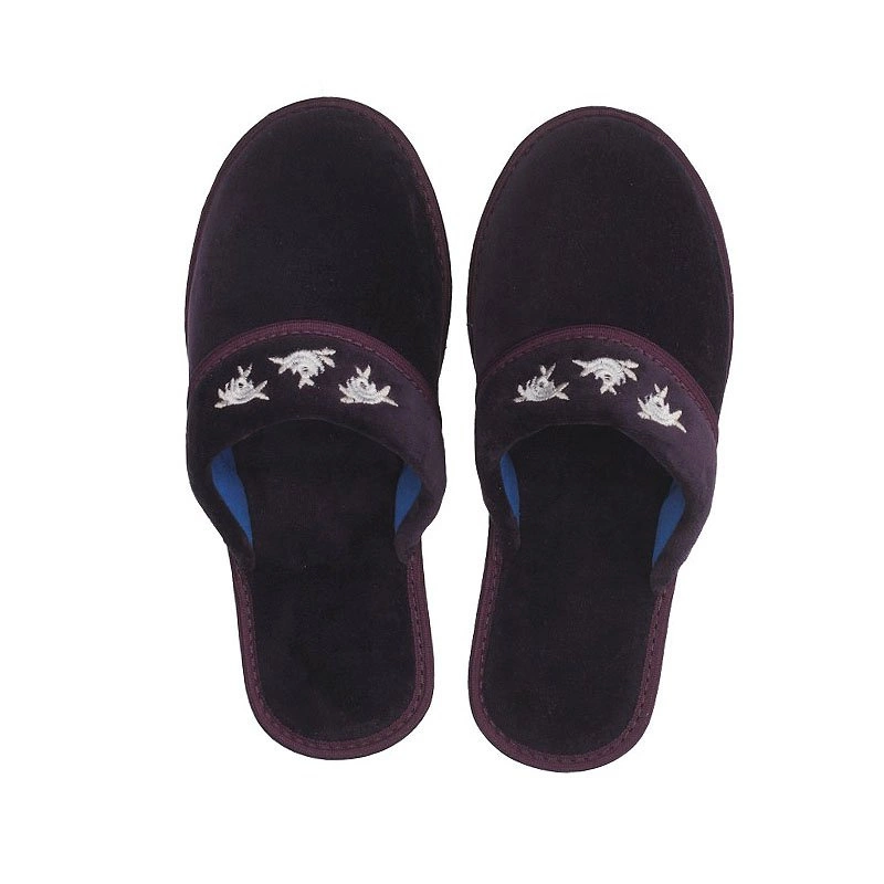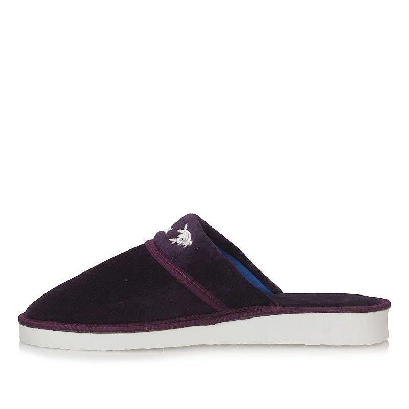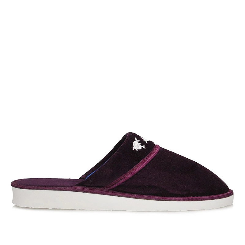 Domowe laczki Meteor to idealny wybór dla Pań ceniących sobie komfort i wygodę. Wierzch i wkładkę wykonano z bardzo przyjemnego w dotyku materiału welurowego. Kapcie są bardzo lekkie, dajace uczucie relaksu dla stóp. Pełny zaokrąglony nosek zapewnia stopom ciepło w chłodne dni. Cholewka w kolorze śliwkowym została przyozdobiona subtelną aplikacją w formie kwiatków. Podeszwa płaska, wykonana z tworzywa, nie zostawiająca śladów na podłodze, dopasosuje się do każdej stopy.